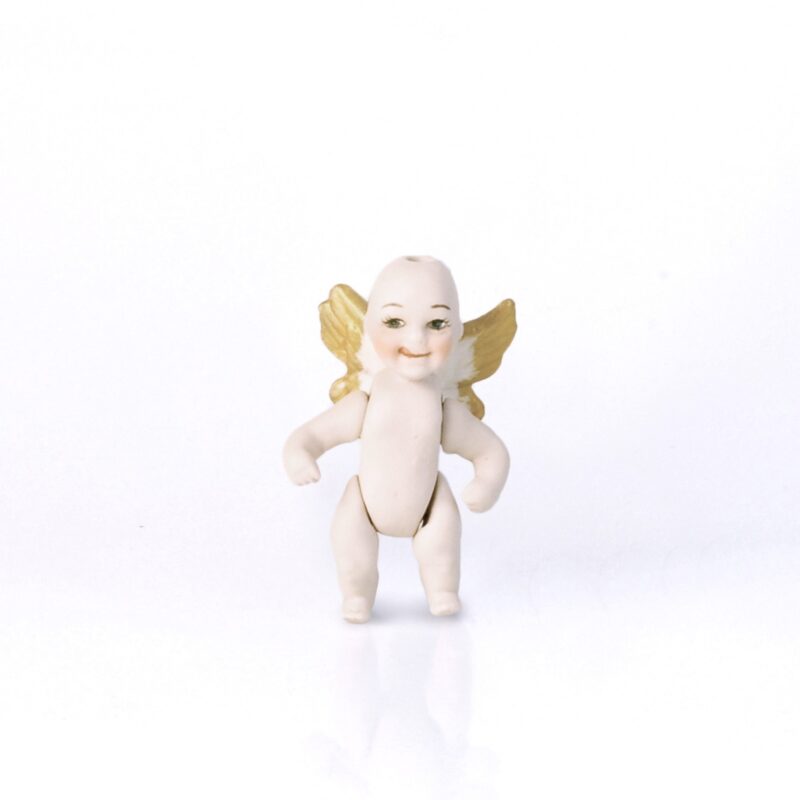 Biscuit porcelain doll depicting a small angel with a contagious smile, with two candid white wings with golden tips.