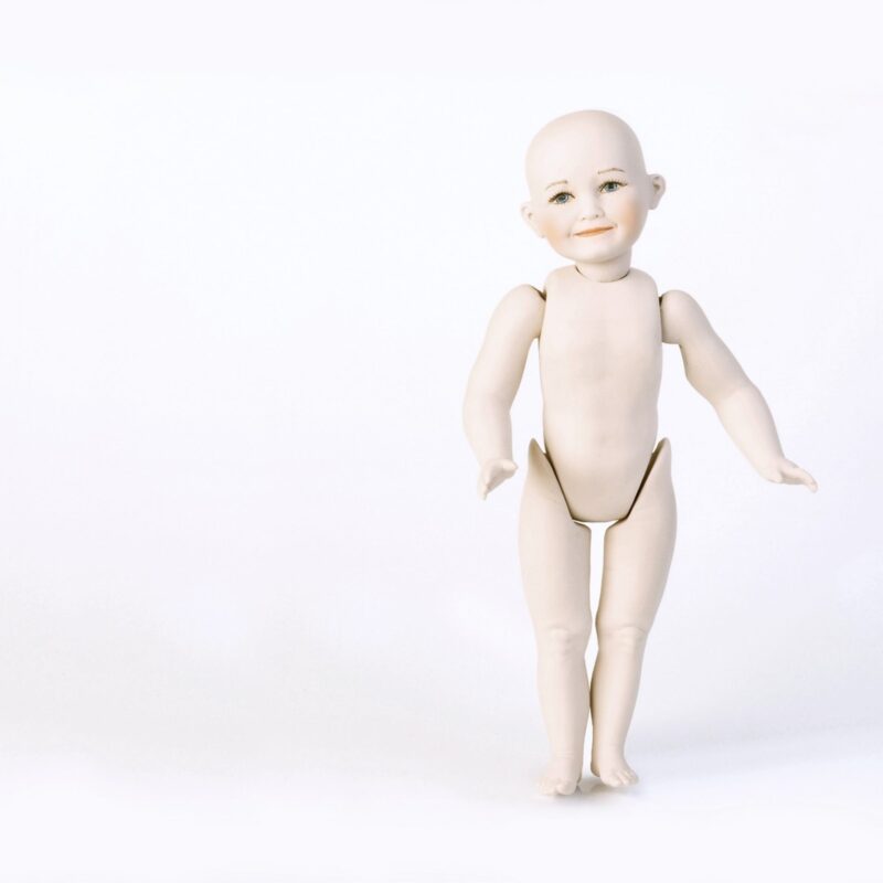 Biscuit porcelain doll depicting a boy or girl with a sweetly amused expression and with the small teeth visible behind the contagious smile.