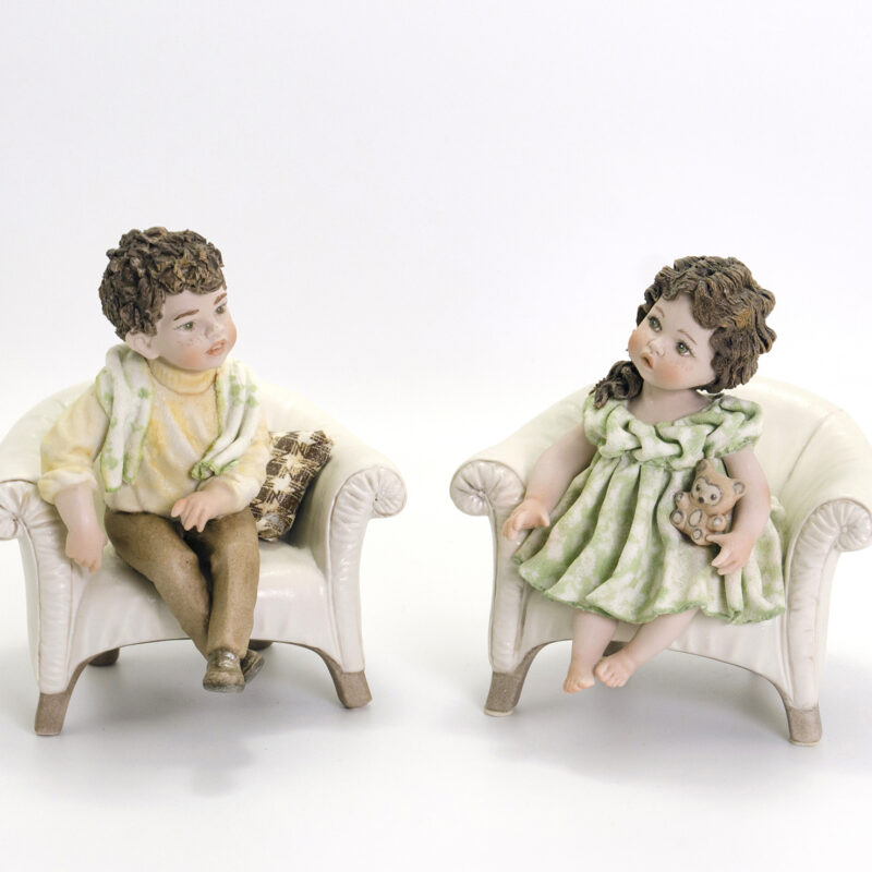 Figura in porcellana raffigurante una bimba seduta su una poltrona grigia. Indossa un abitino azzurro con decori floreali bianchi in rilievo, sopra ad una camicetta con colletto e maniche a sbuffo e una sottogonna entrambe color crema, un paio di scarpine blu e porta i capelli legati in due codine alte, fermate da dei ponpon arancioni. Siede composta, giocherellando con le mani, mentre guarda verso l’alto, sperando che il suo fratellino Piero vada a giocare con lei.