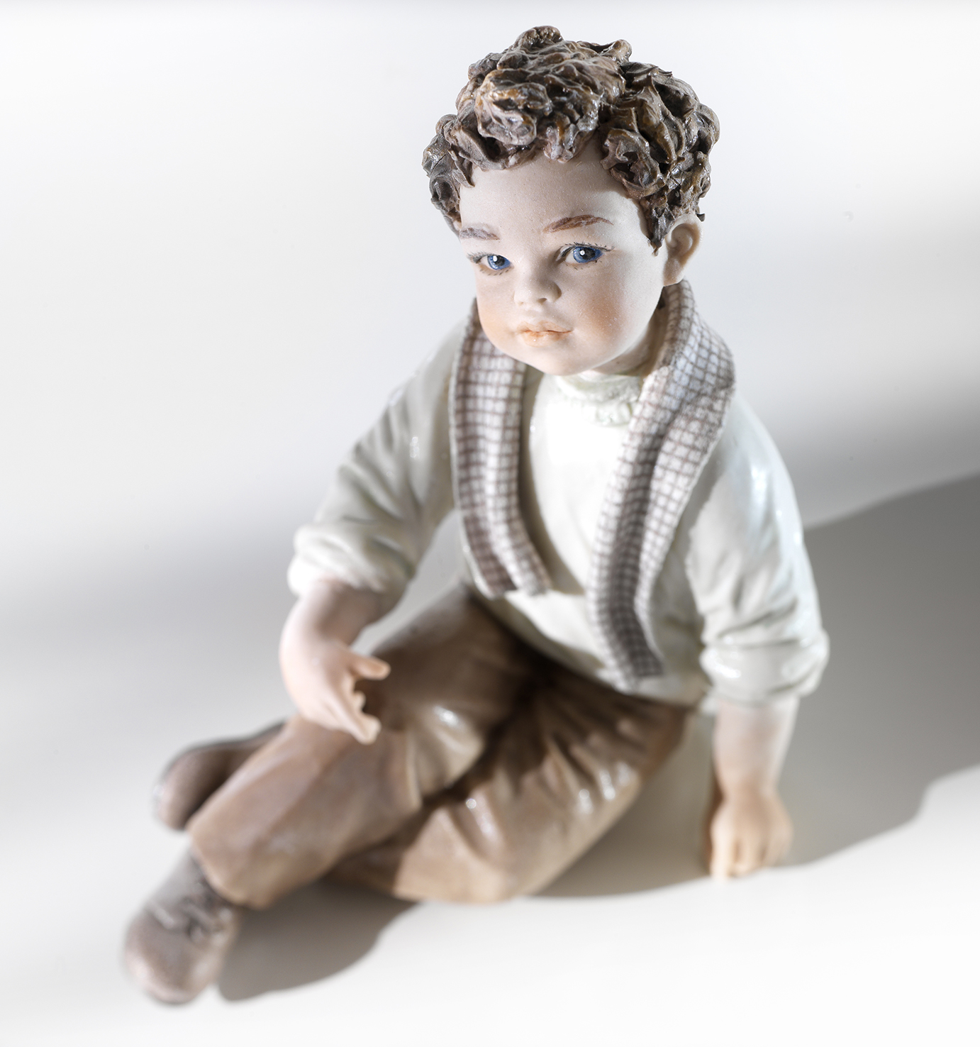 Figura in porcellana raffigurante un bimbo seduto a terra. Indossa un paio di pantaloni marroncini e un maglioncino verde ghiaccio, con una sciarpa a quadretti grigi, con le gambe appena accavallate e una mano sul ginocchio. Guarda lontano, forse sognando la prossima avventura con i suoi amici.