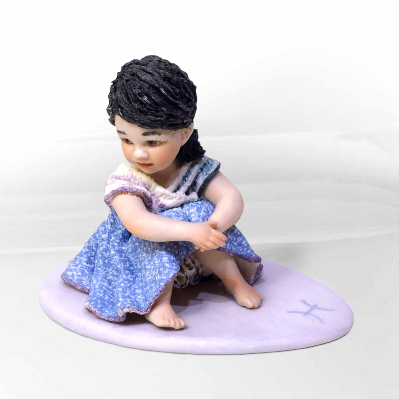 Figura in porcellana raffigurante un’ondina, una ninfa delle acque. Indossa un leggero abito di tulle bianco a simulare la spuma del mare, mentre sta per tuffarsi da un’onda turchese, con i capelli blu legati da una fascia candida attorno alla testa.
