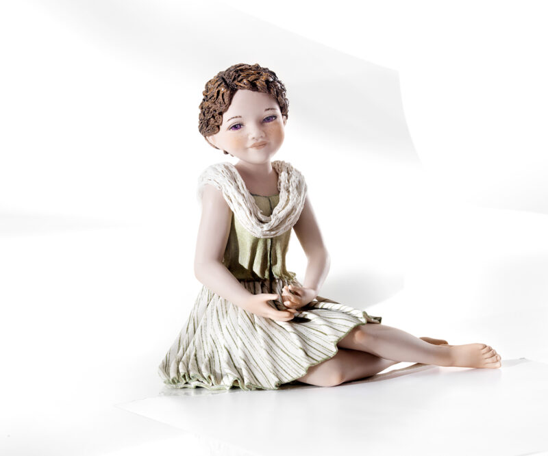 Porcelain figurine of a girl sitting sideways on the ground. She is wearing a pleated skirt with green stripes, a green bodice and a soft white lace scarf. Her hair is styled in a delicate braid. Her sweet purple eyes are looking into the distance.